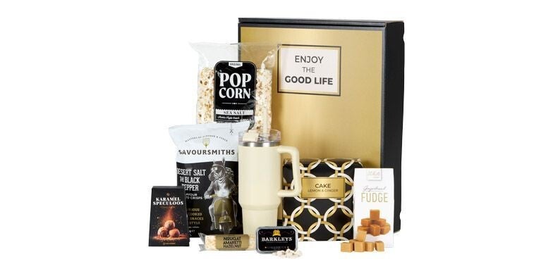 Wat zit erin: Thermo Cup | Citroen gember cake | Speculaas fudge | Amaretti hazelnoot nougat | Gezouten popcorn | Karamel speculoos chocotruffels | Salted black pepper chips | Mint Barkleys
